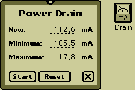 Use Drain to monitor your Newton’s power consumption. After tapping “Start”, Drain will begin sampling the battery current every two seconds, updating its display of the current, lowest, and highest value measured. Tap “Reset” to reset the minimum and maximum value to the current reading.