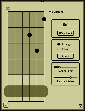 NewtChorder ist ein Hilfsmittel für Gitarristen, mit dem Sie Gitarrenakkorde entwickeln, ausprobieren und sich vorspielen lassen können. NewtChorder zeigt in seinem Hauptfenster eine stilisierte Gitarre mit sechs Saiten und vier Bünden; die Bünde können Sie in 13 Schritten über das Griffbrett verschieben, womit auch Akkorde in höheren Lagen erreichbar werden. Im Bereich des stilisierten Pickup können Sie die Saiten zupfen, indem Sie sie entweder antippen oder mit dem Stift über eine oder mehrere Saiten streichen. Die Lautstärke und die Verzerrung durch Übersteuerung können unabhängig voneinander mit zwei Schiebereglern eingestellt werden. (Die tatsächliche Lautstärke wird abhängig von der Frequenz des jeweils gespielten Tons korrigiert, um die Unzulänglichkeiten des internen Lautsprechers auszugleichen.)