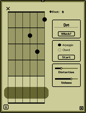 NewtChorder is a guitarist’s tool: you can try out and play various chords. NewtChorder’s main window displays a stylized guitar with six strings and four frets. The frets can actually represent any four consecutive frets on the fretboard. In the pickup area, strings can be picked, either by tapping or with a stroke across a string. Note that more than one string can be picked with a single long stroke. There are two sliders to control volume and distortion. (The actual volume is corrected based on the frequency of the sound to adjust for the deficiencies of the internal speaker.)