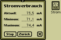 Wissen Sie, wieviel Strom Ihr MessagePad verbraucht? Mit eingeschalteter Hintergrundbeleuchtung? Mit externer Tastatur? Mit Modemkarte? „Strom“ zeigt – alle zwei Sekunden aktualisiert – den aktuellen Stromverbrauch, dessen Maximum und Minimum an.